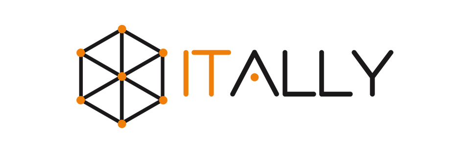 The ITAlly logo is built on a hexagonal shape, symbolizing structure, technology, and innovation. Within the hexagon, interlaced lines form a dynamic network, visually representing connectivity and collaboration. The orange dots symbolize the IT tea